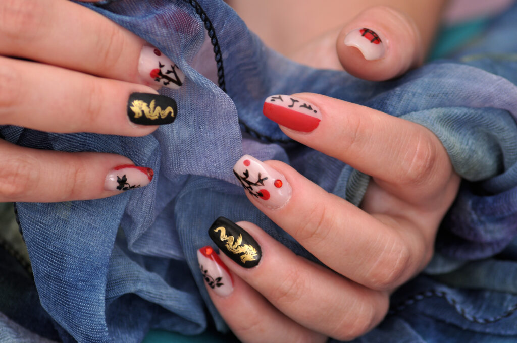 Female hands with a scarf wrapped around them, beauty and well-being, nail art, Asian theme, red and white colors